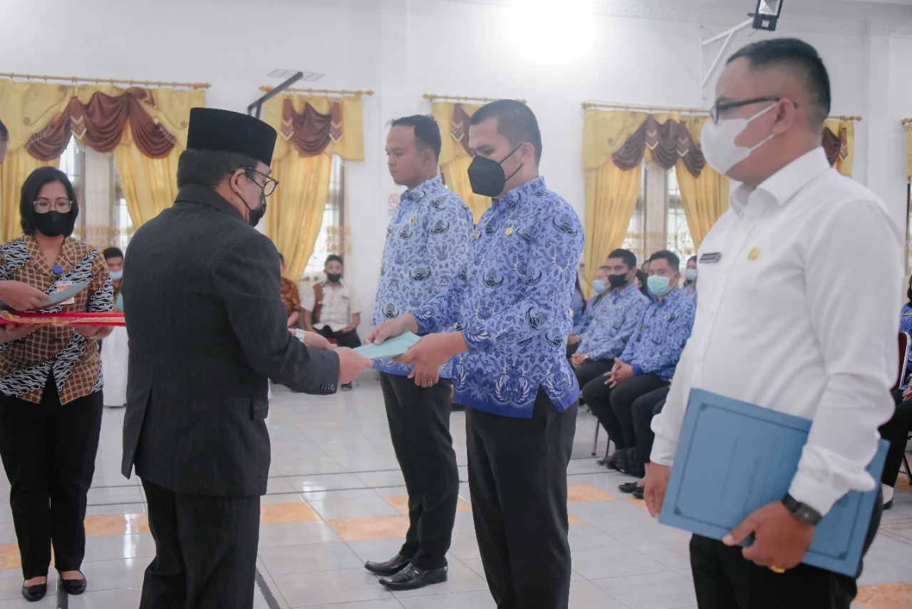 MahesaMediaCenter, Humbahas – Bupati Humbang Hasundutan Dosmar Banjarnahor, SE diwakili Sekretaris Daerah Humbang Hasundutan, Drs. Tonny Sihombing, M.IP laksanakan pengambilan sumpah janji dan penyerahan SK ASN (1/7) di Pendopo Kantor Bupati, Kompleks Perkantoran Bukit Inspirasi Doloksangul.