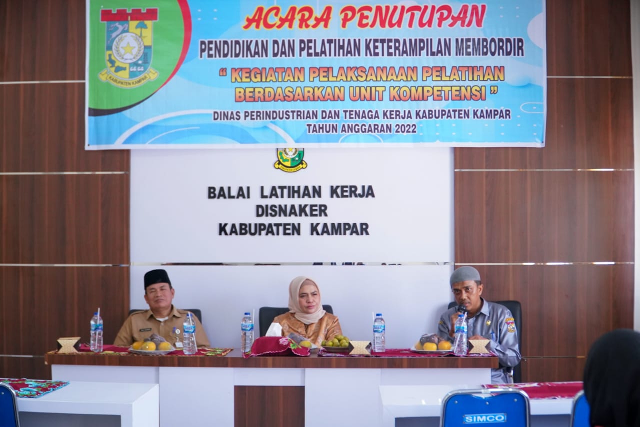 MahesaMediaCenter, Kampar – Ketua umum Dewan Kerajinan Nasional Daerah (Deskranasda) Kabupaten Kampar Deswita Kamsol menutup pendidikan dan pelatihan keterampilan membordir angkatan pertama  yang ditaja oleh Dinas Perindustrian dan Tenaga Kerja Kabupaten Kampar, yang di laksanakan di Balai Latihan Kerja Disnaker desa Ridan Permai Kecamatan Bangkinang Kota Selasa (5/7)