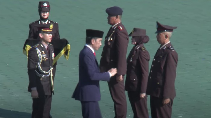 “Menimbang dan seterusnya, mengingat dan seterusnya, memutuskan, menetapkan dan seterusnya. Kesatu, menganugerahkan tanda kehormatan Bintang Bhayangkara Nararya kepada mereka yang nama pangkat dan jabatannya tersebut dalam lampiran keputusan ini sebagai penghargaan kepada anggota Polri yang berjasa besar dengan keberanian, kebijaksanaan, dan ketabahan luar biasa melampaui panggilan kewajiban yang disumbangkan untuk kemajuan dan pengembangan kepolisian atau tidak pernah cacat selama bertugas di kepolisian,” kata Sekretaris Militer Presiden yang juga Sekretaris Dewan Gelar Tanda Jasa dan Tanda Kehormatan, Marsda TNI M Tonny Harjono, membacakan Keputusan Presiden.