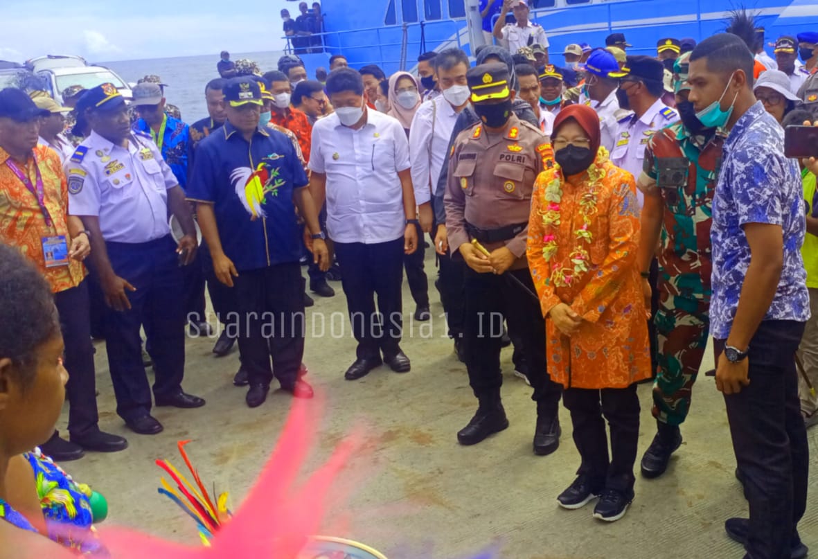 Tiba di negeri sejuta bakau menteri mantan walikota Surabaya disambut langsung oleh Bupati Waropen Yermias Bisai, Wabup Lamek Maniagasi, Forkopimda bersama staf ahli Kementerian sosial, Benhur Tommy Mano di Pelabuhan Pedemani Waren.