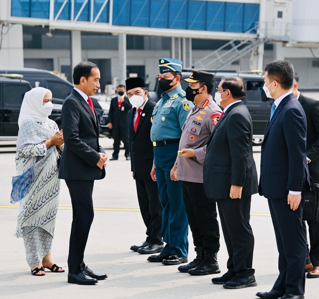 Tampak melepas keberangkatan Presiden Jokowi di bandara adalah Wakil Presiden Ma’ruf Amin, Sekretaris Kabinet Pramono Anung, Duta Besar RRT untuk Indonesia Lu Kang, Kapolri Jenderal Listyo Sigit Prabowo, Kepala Staf TNI Angkatan Laut (KSAL) Laksmana TNI Yudo Margono, dan Penjabat (Pj) Gubernur Banten Al Muktabar. (RAS/