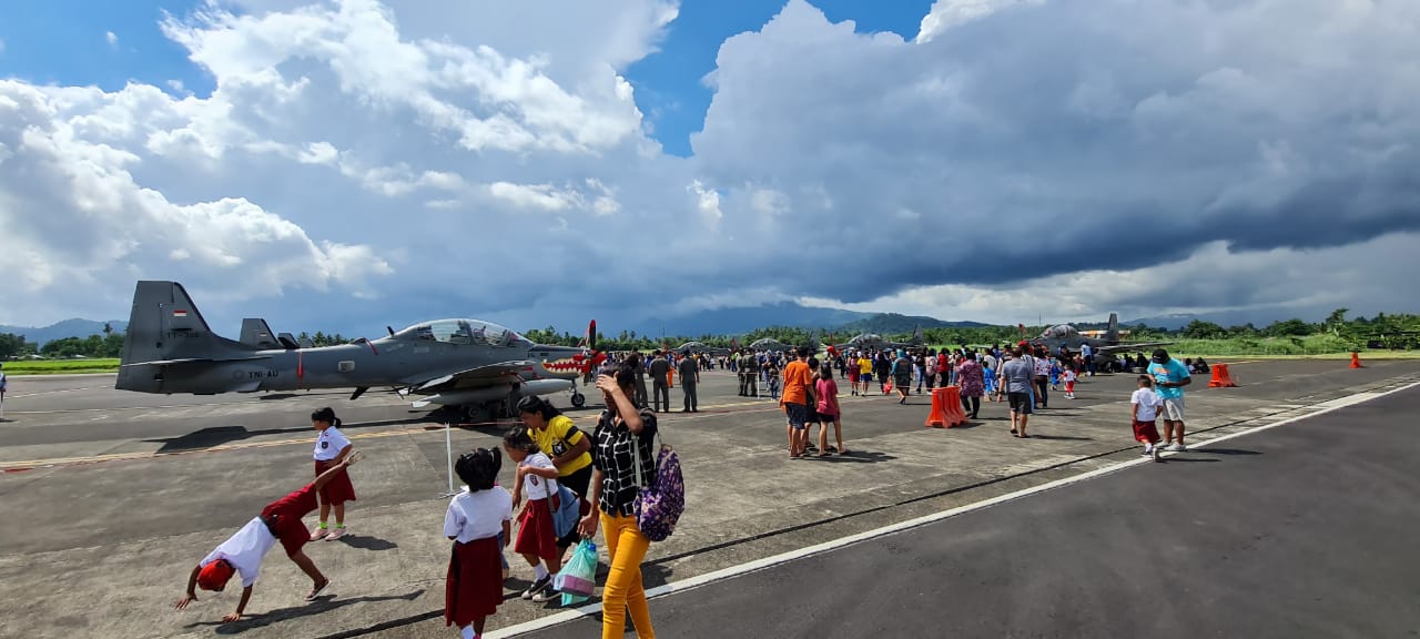 MahesaMediaCenter, Pen_Lanud_Sri – Statik show pesawat TNI AU EMB 314 Super Tucano menarik minat masyarakat Sulawesi Utara Manado di Pangkalan TNI AU Sam Ratulangi, Lapangan, Mapanget, Manado, Sabtu (23/7/2022).