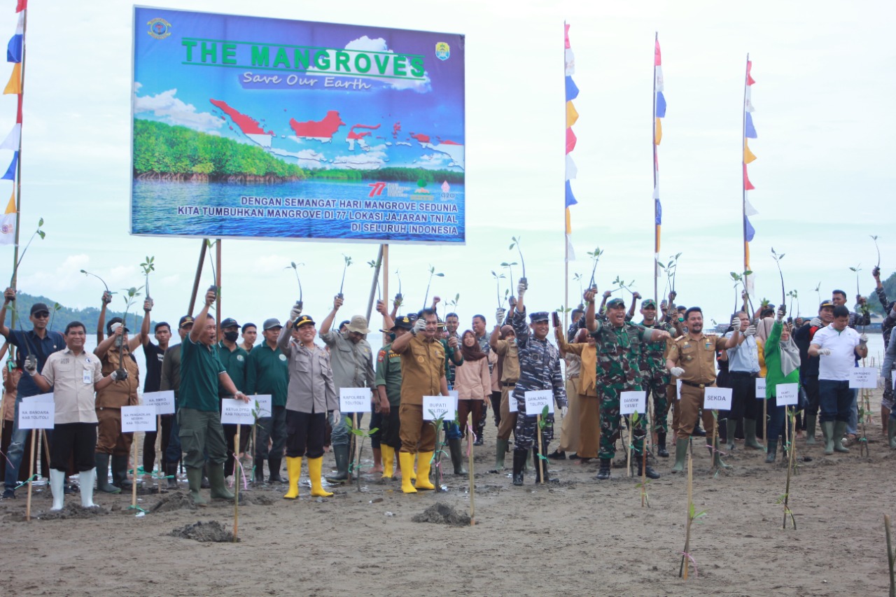 MahesaMediaCenter, Tolitoli – Peringati Hari mangrove sedunia Tahun 2022, Pangkalan TNI Angkatan Laut Tolitoli tanam 5.000 batang pohon mangrove bertempat di perairan Tolitoli belakang gedung Maramba Jl. Baru Kel. Panasakan Kec. Baolan Kab. Tolitoli, Selasa (26/07/2022).