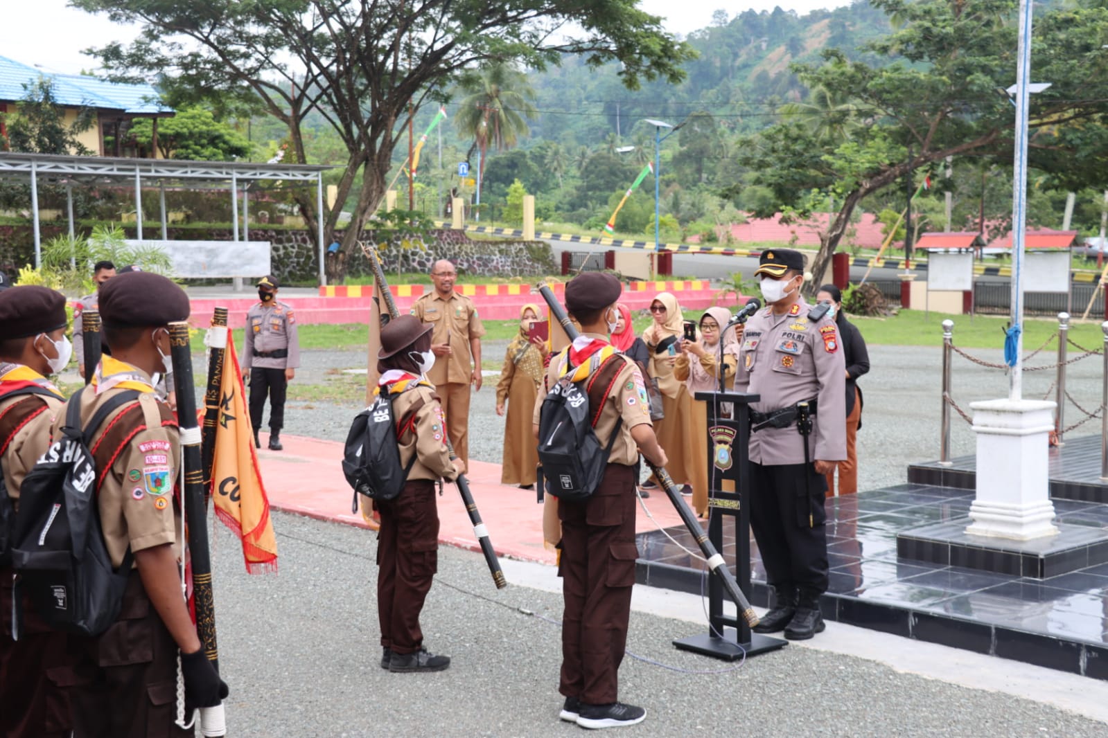 Kapolres Buol saat memberikan sambutan mengatakan bahwa ini merupakan suatu kehormatan bagi kami untuk melepas rombongan Jamnas gerakan Pramuka, berpesan kepada peserta untuk mengikuti dengan sebaik-baiknya.