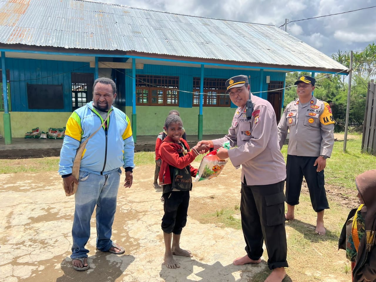 Kedatangan Kapolres Tatiratu dan jajarannya memberikan bantuan 25 sak semen dan 20 karung beras kepada SD Negeri Inpres Bukapa Distrik Kamuu di jalan Widiwiyai.