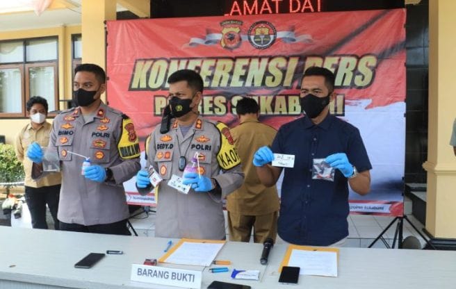 Kapolres Sukabumi AKBP Dedy Darmawansyah Nawirputra, menjelaskan pertama oknum Kades (AA) ditangkap di Kampung Cigadog Desa/Kecamatan Sagaranten dan stafnya (NF) di Kampung Babakan Anyar Desa Pasanggrahan Kecamatan Sagaranten Kabupaten Sukabumi.