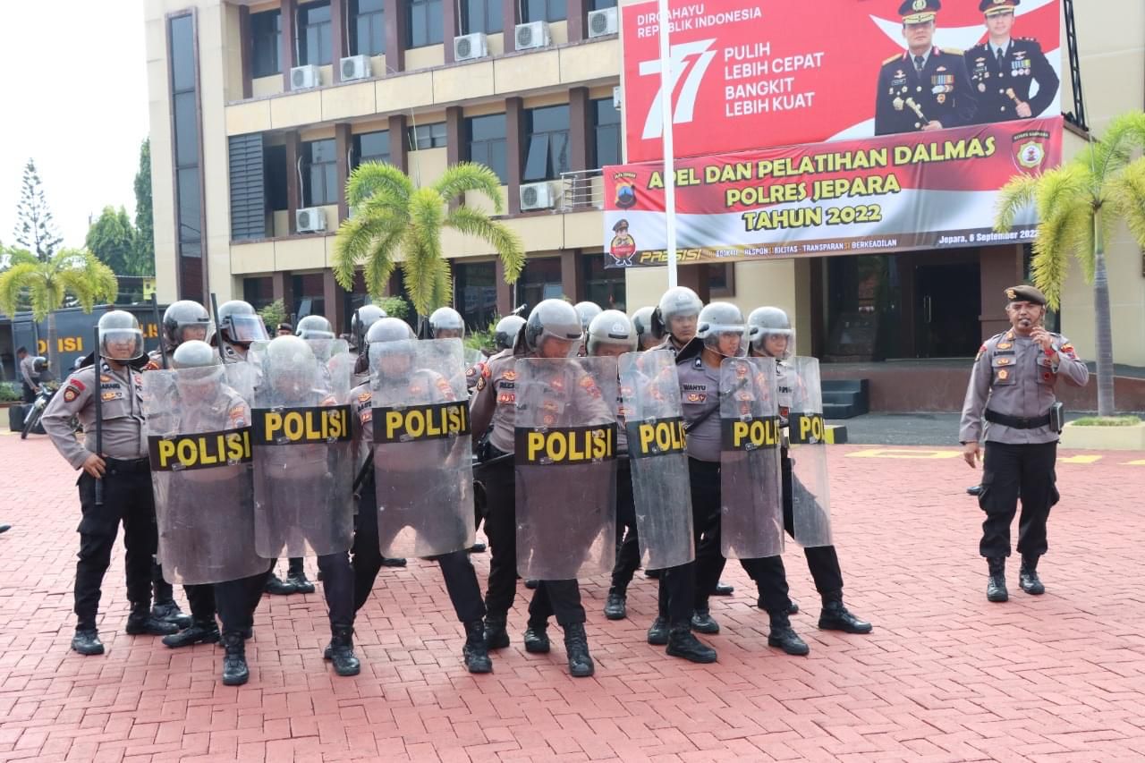MahesaMediaCenter, Jepara — Untuk menjamin kamtibmas yang kondusif di wilayah Kabupaten Jepara, Polres Jepara Polda Jateng menggelar pelatihan pengendalian massa (Dalmas) yang diikuti ratusan personil di halaman Polres Jepara, Selasa (06/09/2022).