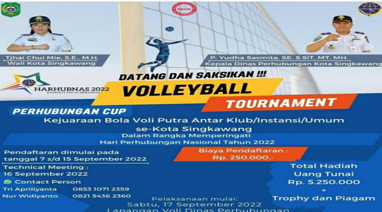 MahesaMediaCenter, Singkawang (Kalbar) – Dalam rangka memperingati Hari Perhubungan Nasional (Harhubnas), Dinas Perhubungan (Dishub) Kota Singkawang akan menggelar Kejuaraan Bola Volly Putra antar klub/instansi/umum di Lapangan Bola Voli Dishub pada tanggal 17 September 2022.