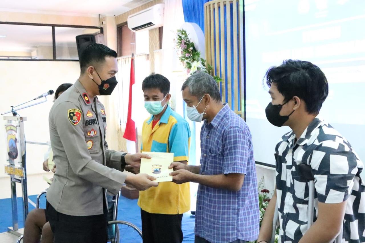 Dalam kegiatan tersebut juga, Satlantas memberikan bantuan sembako dan tali asih kepada Korban laka lantas yang secara simbolis diberikan Wakapolres Jepara Kompol Berry, ST., SIK, didampingi Kasat Lantas AKP R Ade Triken Deayomi, SH., SIK., MH.