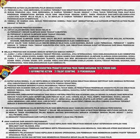 Penerimaan ini sesuai dengan Pengumuman Kapolda Sulteng Nomor : Peng/34/IX/DIK.2 1/2022 tanggal 13 September 2022 atas dasar putusan Kepala Kepolisian Negara Republik Indonesia Nomor : Kep/1201/IX/2022 tanggal 7 September 2002 tentang Penyelenggaraan Rekrutmen Proaktif Bintara Polri TA. 2023