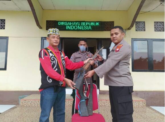 Penyerahan Senpi tersebut bertempat di Polsek Monterado dan diterima langsung oleh Kapolsek Monterado Polres Bengkayang Polda Kalbar IPTU Edy Wuriyawan, S.H., M.H.