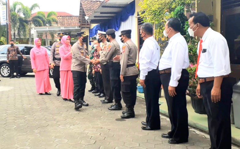 Kapolres Gunungkidul bersama ibu, didampingi oleh PJU Polres Gunungkidul dan pengurus Bahayangkari dalam kunjungan kerjanya disambut oleh Kapolsek Ponjong AKP Yulianto, S.H., M.A.P., beserta staf.