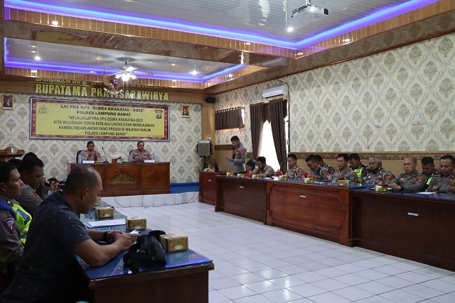 MahesaMediaCenter, Lampung Barat – Polres Lampung Barat– Akbp Heri Sugeng priyantho,S.IK, MH selaku Kapolres Lampung Barat memimpin pelaksanaan Latihan pra Operasi (Latpraops) Zebra Krakatau 2022 di Aula Mapolres Lampung Barat, Kamis (29/09/2022).