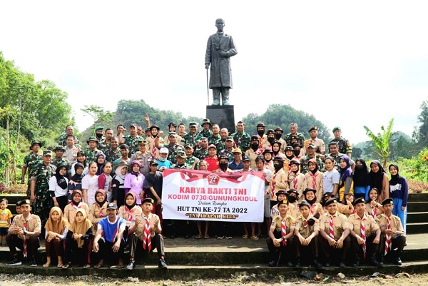 MahesaMediaCenter, Gunungkidul – Kodim 0730/Gunungkidul melaksanakan Karya Bakti TNI di Monumen Pangsar Patung Jend. Sudirman serta tanam pohon buah pada momentum peringatan HUT TNI Ke-77 tahun 2022 dengan tema ” TNI ADALAH KITA” yang dilaksanakan di Padukuhan Bedoyo, Kalurahan Bedoyo, Kapanewon Ponjong, Kabupaten Gunungkidul.(02/10/2022).