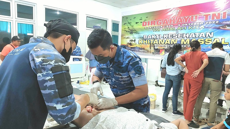MahesaMediaCenter, Manado – Gabungan tim kesehatan TNI di Sulut melaksanakan Bhakti Kesehatan Khitanan Massal dalam rangka memperingati HUT ke-77 Tentara Nasional Indonesia (TNI) tahun 2022 di Rumkital dr Wahyu Slamet Bitung, Selasa (04/10/2022).