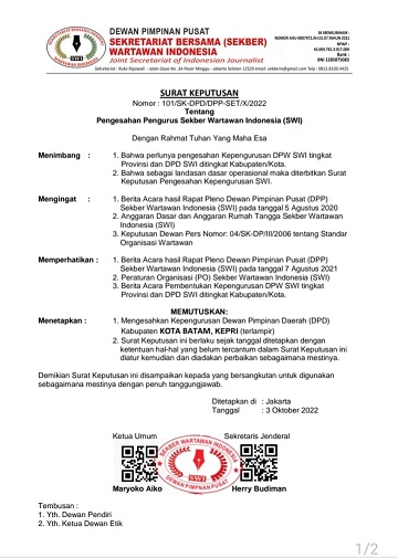 Dari hasil pemilihan secara aklamasi itu, maka DPP SWI mengeluat kan SK DPD SWI kota Batam dengan no sk : 101/SK-DPD/DPP-SET/X/2022.