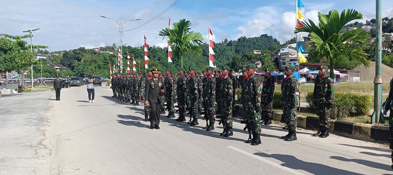 Upacara memperingati HUT KE-77 Tentara Nasional Indonesia TA. 2022 di wilayah Kabupaten Fakfak di pimpin langsung oleh Kolonel Inf Hartono, S.I.P (Danrem 182/JO) selaku Inspektur Upacara.