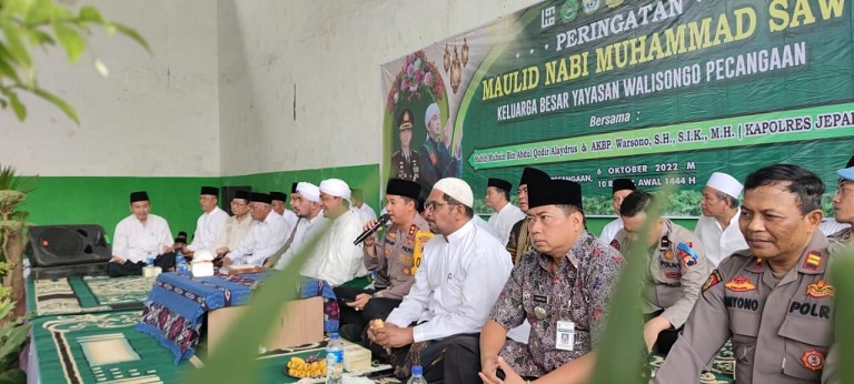 MahesaMediaCenter, Jepara – Mempererat tali silaturahmi antara Anggota Polri dengan warga masyarakat, Kapolres Jepara AKBP Warsono, SH., SIK., MH, didampingi Kapolsek Pecangaan AKP Andy Pradana, SIK., SH dan PJU Polres Jepara menghadiri acara memperingati Maulid Nabi Muhamad SAW 1444 H di Ponpes Yayasan Walisongo Pecangaan, Kamis (06/10/2022).