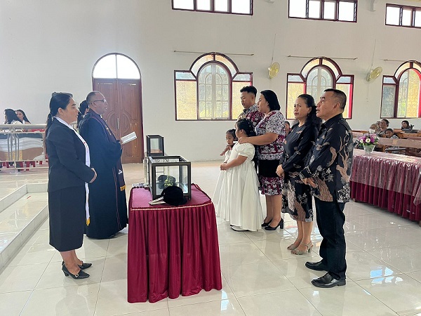 MahesaMediaCenter, Talaud – Minggu 9-10-2022 Ibadah Sakramen Baptisan anak dari Kapolres Kepl. Talaud AKBP Dandung Putut Wibowo, S.I.K., S.H., M.H. Dilaksanakan di Gereja Sangkundiman Melonguane Kelurahan Melonguane Timur Kecamatan Melonguane Kabupaten Kepulauan Talaud.