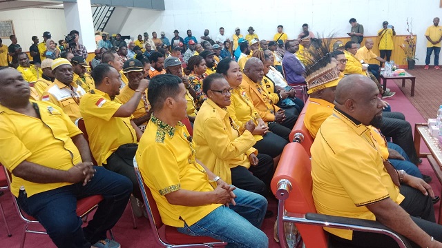 “Turut hadir dalam musyawarah daerah Pertama Partai Golongan Karya Provinsi Papua Tengah, Plt. Ketua DPD Partai Golkar Prov. Papua Dr. H. Ahmad Dolly Kurnia Tandjung, S.Si, M.T, Sekretaris DPD Partai Golkar Prov. Papua Drs. Yakob Ingratubun, MM, Anggota DPR RI Fraksi Partai Golkar & Sek. Pemenangan Pemilu Papua-PB , Ketua Umum AMPG Pusat dan Ketua BSN Syahmud Ngabalin, Ketua Harian Partai Golkar Prov Papua & Ketua Komisi I DPRP Fernando Yansen Tinal, Bupati Kab. Deiyai Ateng Edowai,S.Pd.K, M.PD, Bendahara Umum Partai Golkar Prov.Papua Aryadi, SE.
