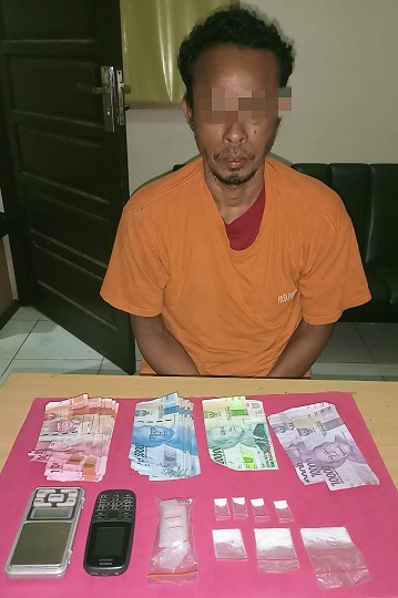 Dari hasil penggeledahan di rumah pelaku berhasil diamanakan barang bukti berupa 1 paket besar di duga Narkotika jenis shabu-shabu, 1 paket sedang, 4 paket kecil, satu ungkus plastik bening berisikan kosong, timbangan digital dan yang tunai Rp 1.990.000 ribu.