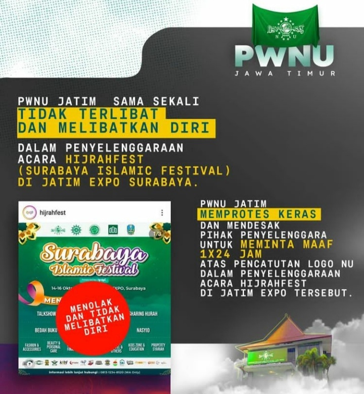 PWNU Jatim mengatakan, Sama sekali tidak terlibat apalagi sampai melibatkan diri dalam penyelenggaraan acara Hijrahfest, Surabaya Islamic Festival itu.