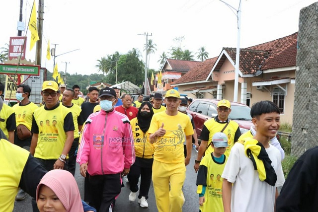 Bupati Pesisir Barat Dr. Drs. Agus Istiqlal, S.H., M.H mengikuti Jalan Sehat tersebut yang berlokasi di Kantor Sekretariat Partai Golkar Pesisir Barat, Jl. Fatmawati Soekarno, Jalur 2 Bandara M.Taufiq Kiemas, Pekon Seray, Kec. Pesisir Tengah.