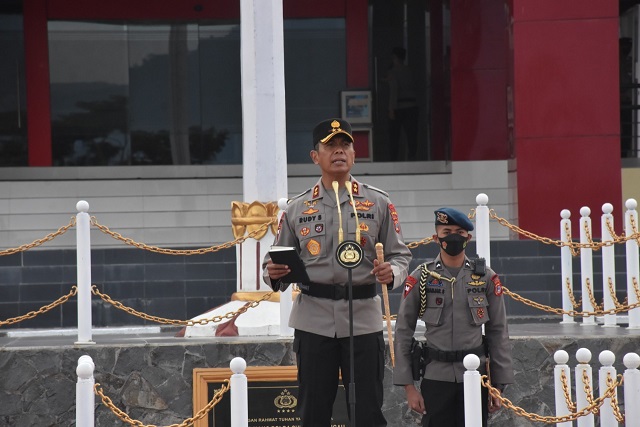 “Ucapan terima kasih dan apresiasi bapak Presiden kepada Polri atas penanganan covid-19, karena dengan kita sebagai garda terdepan penanganan covid-19 ekonomi bangsa Indonesia menjadi baik, sehingga tidak terjadi krisis” Ucap Irjen Rudy meneruskan arahan Presiden RI.