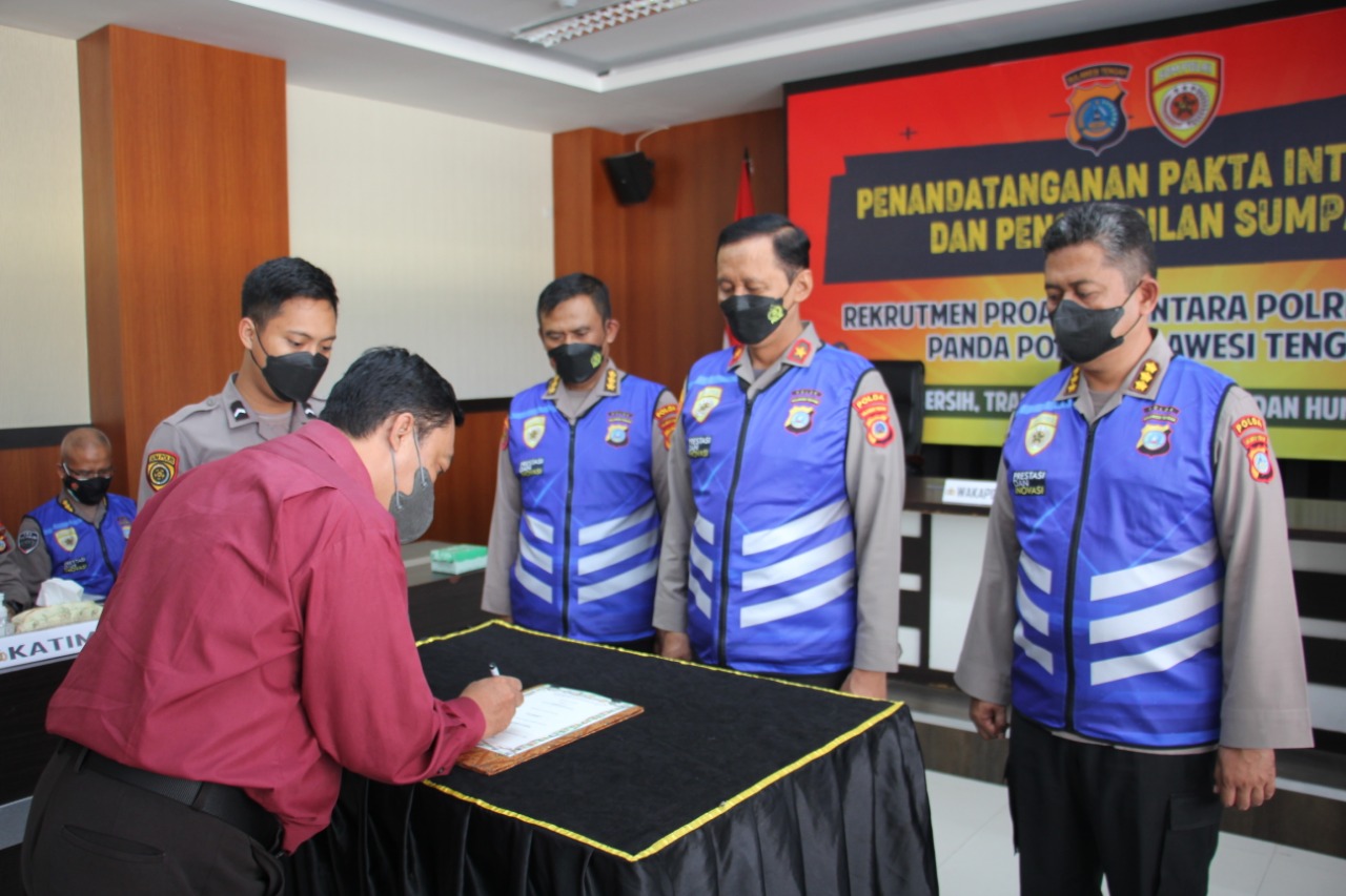 Sebanyak 65 pemuda-pemudi Sulteng hari ini mengikuti penanda tanganan pakta integritas dan pengambilan sumpah panitia, peserta dan orang tua yang dipimpin oleh Wakapolda Sulteng Brigjen Polisi Hery Santoso, SIK, MH di Aula lantai I Polda Sulteng, Senin (17/10/2022) sore