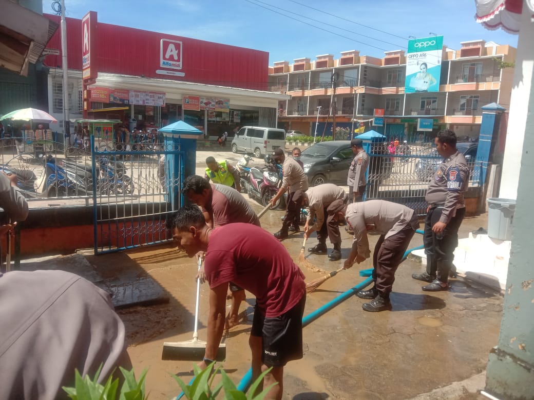 Selesai pelaksanaan Apel pagi, seluruh anggota dikerahkan kelapangan untuk membersihkan sisa-sisa lumpur yang dibawa banjir, jelas Kapolres Tolitoli melalui Kasihumas Ajun Komisaris Polisi Anshari