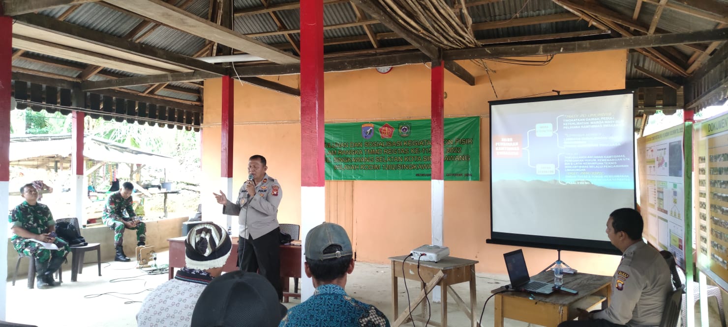 MahesaMediaCenter, Singkawang – Satgas TMMD ke-115 Kodim 1202/Skw dan Polres singkawang memberikan penyuluhan kesadaran hukum, HAM dan Kamtibmas kepada masyarakat kelurahan Pangmilang kec Singkawang Selatan, trans SP II. Rabu (26/10/22)