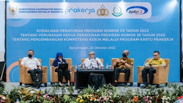 Sosialisasi Peraturan Presiden tentang Perubahan Kedua atas Peraturan Presiden Nomor 36 Tahun 2020 tentang Pengembangan Kompetensi Kerja Melalui Program Kartu Prakerja di Banjarmasin ini dibuka Deputi IV Kementerian Koordinator Bidang Perekonomian Rudy Salahuddin. Acara ini diikuti 75 peserta termasuk Kadisnaker Provinsi Kalimantan Selatan Ifran Sayuti, Kepala Perwakilan BPKP Kalsel Rudy M. Harahap, Asisten Tindak Pidana Khusus Kejaksaan Tinggi Kalsel Dwianto Prihartono, Asisten Perdata dan Tata Usaha Negara Kejati Kalsel Firmansyah Subhan, Direktur Reserse Kriminal Khusus Polda Kalsel Kombes Pol Suhasto, para Kajari Provinsi Kalimantan Selatan, perwakilan para Kadisnaker Kabupaten dan Kota se-Provinsi Kalimantan Selatan, serta beberapa perwakilan Polres di lingkungan Polda Kalsel.