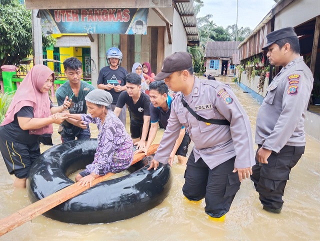 Dengan sigap anggota Polri turun membantu proses evakuasi warga.