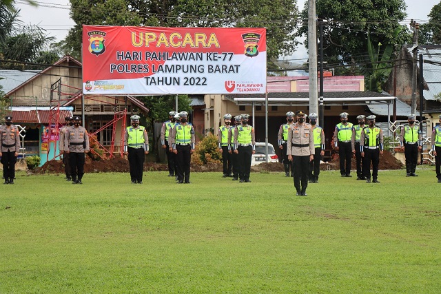 Upacara Peringatan Hari Pahlawan diikuti oleh Perwira Polres Lampung Barat, Sat Samapta 1 Peleton, Sat Lantas 1 Peleton, gabungan Staf 1 Peleton, gabungan Sat Reskrim, Sat Narkoba, dan Sat Intelkam 1 Peleton, Siswa Latja SPN 1 Peleton.