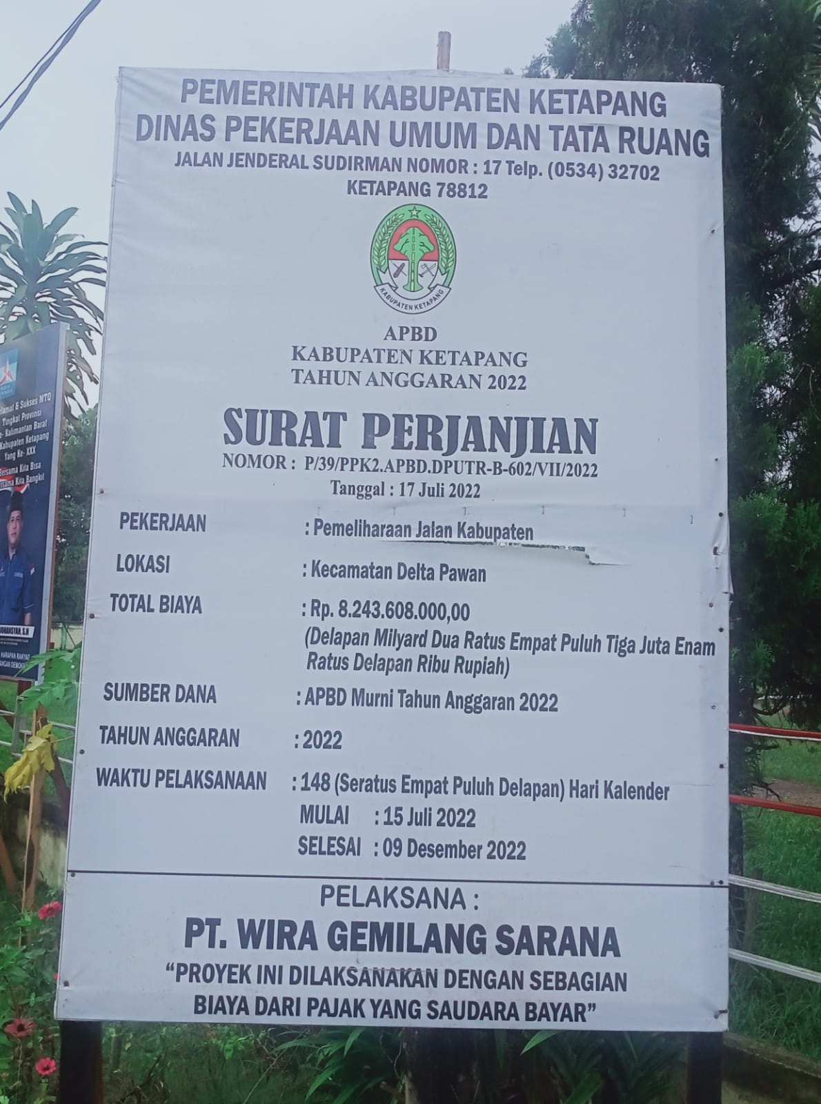 Berdasarkan data informasi LPSE Kabupaten Ketapang, judul kegiatan Pemeliharaan Jalan Kabupaten dan Lokasi menyeluruh se Kecamatan Kabupaten Ketapang, anggaran senilai Rp 8.384.834.000 sumber Dana APBD Tahun 2022 Kabupaten Ketapang. Satker Dinas Pekerjaan Umum Dan Tata Ruang (DPUTR) Kabupaten Ketapang Kalimantan Barat .