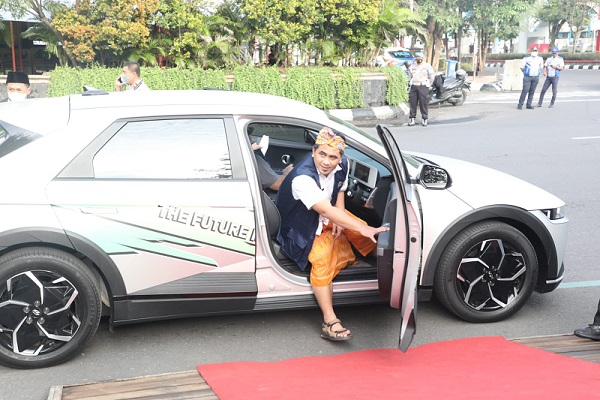 MahesaMediaCenter, Semarang – Wakil Gubernur Jawa Tengah, Taj Yasin Maimoen mencoba kemampuan mobil listrik Ioniq 5 sejauh 6 kilometer di Semarang. Setelah menjajal dari kantor ESDM Jateng menuju Lapangan Pancasila, Wagub mengaku terkesan dengan tarikan mobil listrik sangat ringan atau tidak berbeda dengan mobil berbahan bakar minyak.