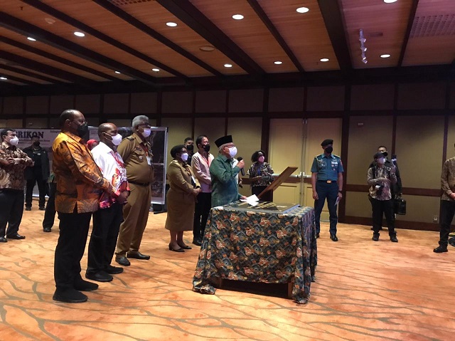 Tiba di Rimba Papua Hotel pukul 13.50 WIT, Wapres didampingi Ibu Wury Ma’ruf beserta rombongan disambut meriah oleh Tarian Selamat Datang oleh Sanggar Tari Kanaan.