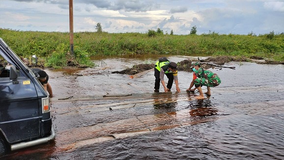 Ruas Jalan Pelang Terendam Genangan Air, Anggota Polsek Matan Hilir Selatan Sigap Bantu Warga