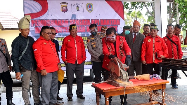 Pemusnahan dilakukan setelah usai ditanda tangani BA Serah terima dan pemusnahan diaula Tribrata dengan cara digirinda disaksikan langsung Bupati Melawi H.Dadi Sunarya Usfa Yursa,S.Pd,Ketua DAD Kabupaten Melawi Drs.Kluisen, organisasi kemasyarakatan dan undangan.