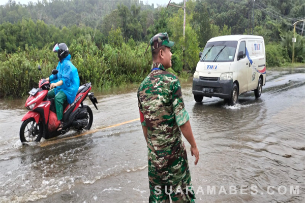 Babinsa Karimunting 1202-03/Sungai Duri SERTU Sugiyanto dengan sigap mengambil sikap untuk terjun diareal banjir mengarahkan kendaraan yang melewat,