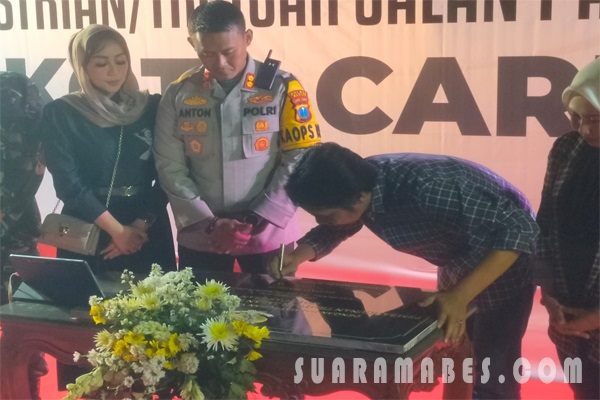 Peresmian pembangunan Trotoar di Jalan Panglima Sudirman Mejayan ditandai dengan penandatanganan prasasti dan penekanan tombol sirene oleh Bupati Madiun.