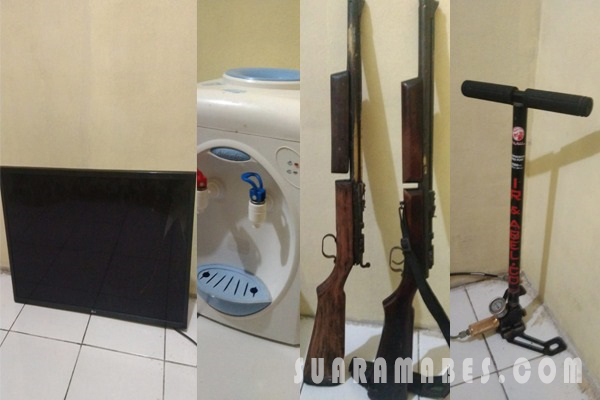Ditambahkannya, dalam pengembangan usai penangkapan, petugas juga berhasil mengamankan sejumlah barang bukti. Terdiri dari, 2 pucuk senapan angin, dan pompa, televisi, dispenser serta speaker aktif masing-masing 1 buah.