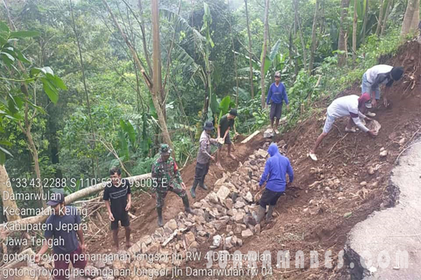 MahesaMediaCenter, Jepara – Untuk mencegah terjadinya longsor yang dapat menimbulkan korban jiwa, Babinsa Serma Munif anggota Koramil 08/Keling, bersama Bhabinkamtibmas dan masyarakat bergotong royong membuat talud penahan longsor di Dukuh Mendono, RT 02/RW 04, Desa Damarwulan, Kecamatan Keling, Kabupaten Jepara. Sabtu (7/1/2023).
