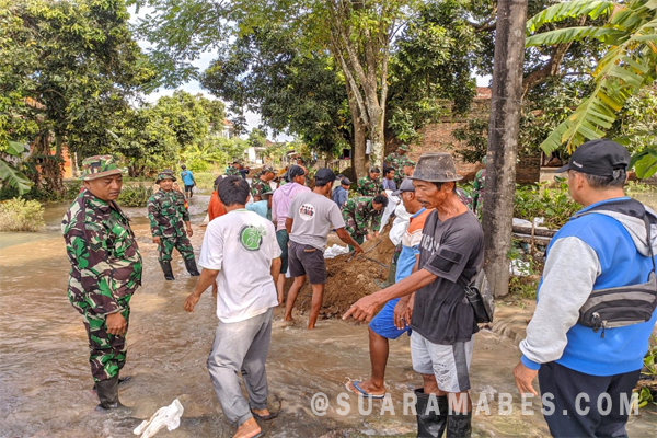 Anggota TNI bersama warga dan juga relawan dari dinas pengairan serta BPBD Kabupaten Jepara berjibaku untuk bergotong-royong dalam pembuatan tanggul darurat.