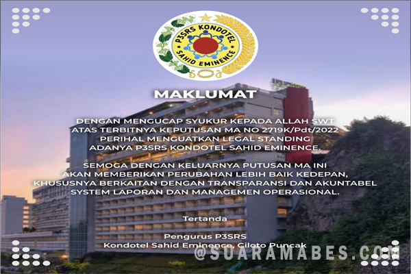 “Alhamdulillah saat ini putusan Mahkamah Agung No. 2719K/Pdt/2022 sudah memenangkan perkara kedudukan P3SRS Hotel Le Eminence. Secara sah diakui sesuai dengan Undang undang Rumah Susun No 20 Tahun 2011. Sepatutnya pengelola menghormati putusan MA dan menyerahkan hak pengelolaan hotel kepada P3SRS sesuai amanah undang undang” tambah Herman Saleh