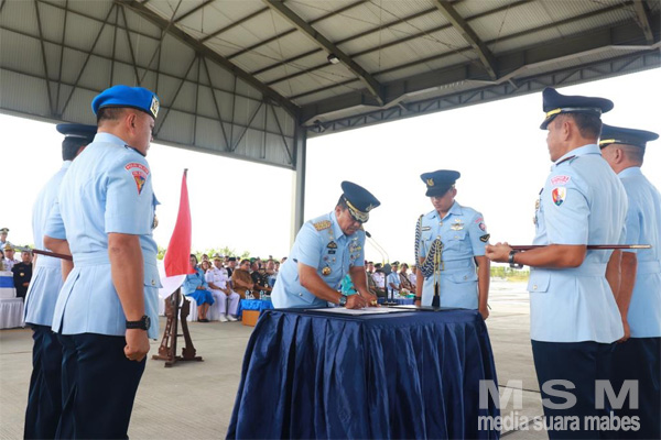 MahesaMediaCenter, Manado – Panglima Komando Operasi Udara II Marsda TNI Widyargo Ikoputra, SE., MM., CIQaR., serahterimakan jabatan Komandan Lanud Sam Ratulangi dari Marsma TNI M. Satriyo Utomo, SH., kepada Kolonel Pnb Muhammad Mujib, SE., MM., di Apron Baru Base Ops Lanud Sam Ratulangi, Mapanget, Selasa (24/01/2023)