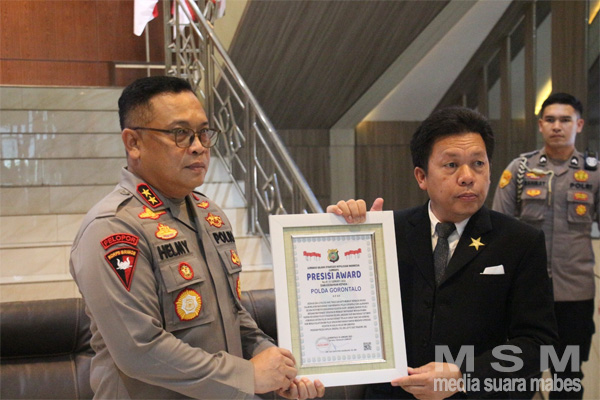 MahesaMediaCenter, Gorontalo – Senin siang (30/1/2023), di Lobby Presisi Polda Gorontalo, Kapolda Irjen Pol. Helmy Santika, SH.,SIK.,M.Si menerima penghargaan “Presisi Award” dari Lembaga Kajian Strategis Kepolisian Indonesia ( Lemkapi) yang diserahkan langsung oleh Direktur Eksekutif Lemkapi Dr. Edi Saputra Hasibuan, SH., MH.