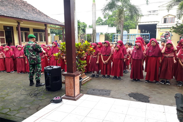 MahesaMediaCenter, Jepara – Guna menumbuhkan jiwa patriotisme terhadap generasi muda penerus bangsa, Pgs Danramil 04/Pecangaan Pelda Sutarman bersama satu orang anggota memberikan wawasan kebangsaan kepada murid Sekolah Dasar Negeri I, Desa Troso, Kecamatan Pecangaan, Kabupaten Jepara. Rabu, (8/2/2023).
