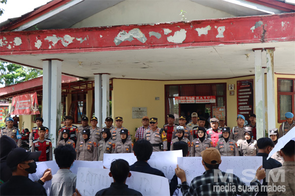 MahesaMediaCenter, Lampung Barat — Personil Polres Lampung Barat Polda Lampung laksanakan pengamanan unjuk rasa/ aksi damai yang dilakukan oleh Gabungan pemuda Lampung (GAPELAM) di Pemkab Lampung Barat, Kamis (09/02/2023).