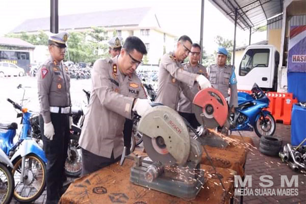 “Pelanggaran saat ini ada kenaikan, tilang juga mengalami kenaikan, pagi ini hasil yang sudah kita amankan yakni knalpot brong kita musnahkan”, kata Kapolres.
